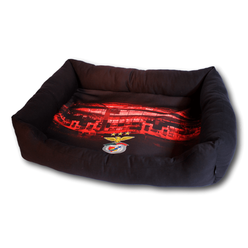 Small dog bed with the image of the SL Benfica stadium. In black with the image of the stadium in the night and the colored emblem logo. The base is made of 100% cotton twill and the pillo...