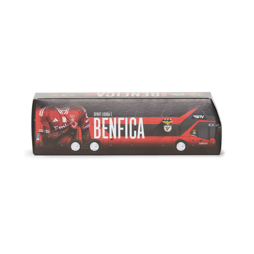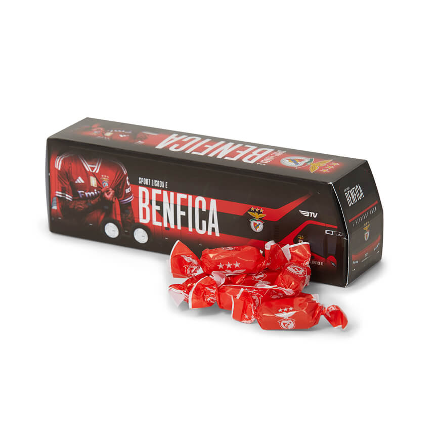 Packaging with the image of the Sport Lisboa e Benfica bus, filled with 200 gr of fruit-flavored gummies. An excellent birthday gift.