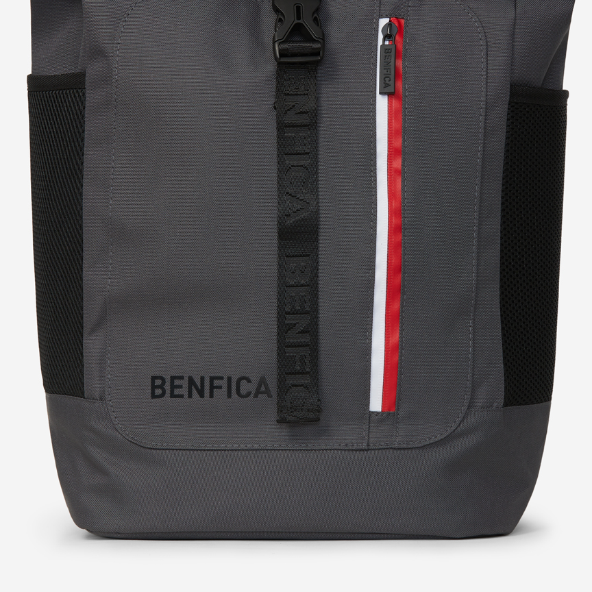 On the front of the rucksack there's a zip pocket with a "Benfica" logo and red and white detailing and the inscription "Benfica", embossed in black.