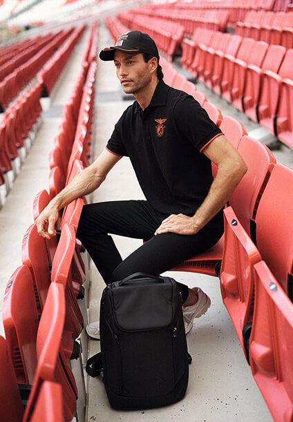 The black SL Benfica executive backpack is printed with the club's emblem and motto in black and has a rubber label.