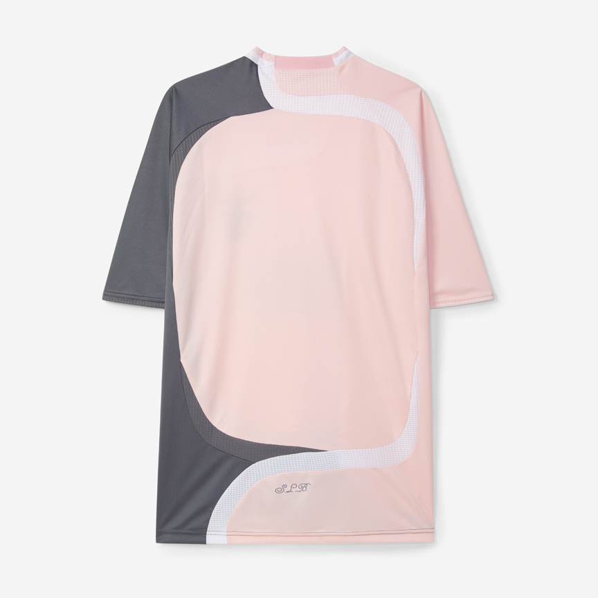 It was a disruptive shirt at the time, both in terms of its colours and its cut. The jersey is pink, with two white and grey accents. The right sleeve is pink and the left sleeve is grey.