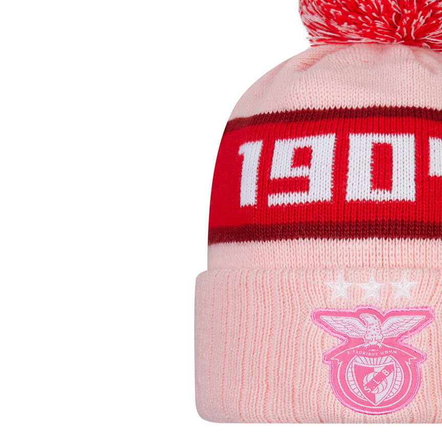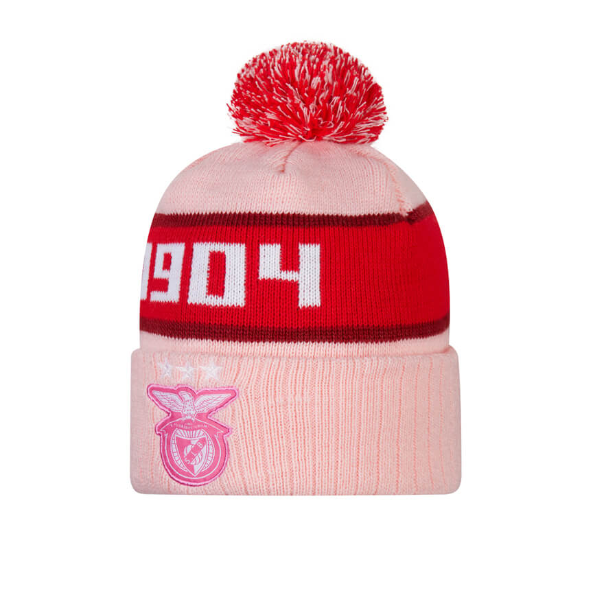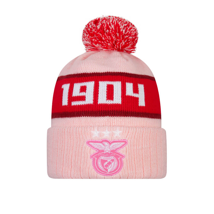 Pink beanie with a red stripe with 1904 in white, pink and red pom-poms and the club emblem, in pink and white, on the front.
