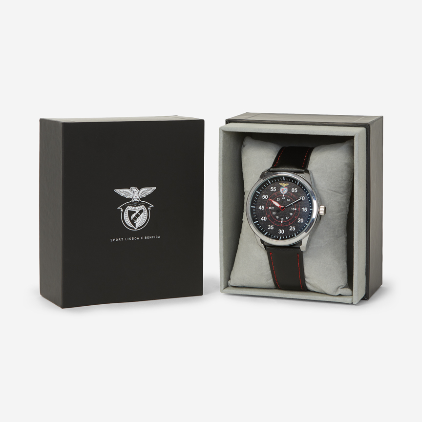 The watch comes with a padded case with the monochrome white SL Benfica emblem.