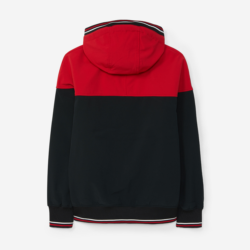 It has a full central zip, ribbed cuffs with two white and red accents, a hood and zipped side pockets.