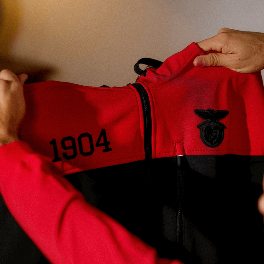 SL Benfica jacket in black with red on the shoulders. On the left side of the chest we have the club's emblem, rubberised and in black, and on the right side the inscription alluding to th...
