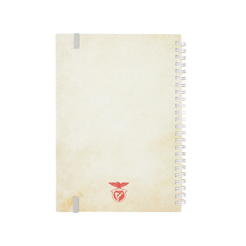 A5 notebook with a hardcover in red with an illustration of the retro team on the front and the back cover in beige.