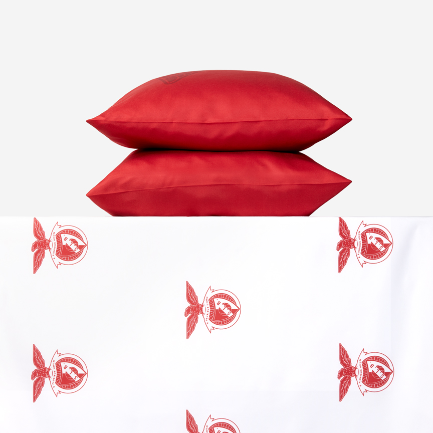 Ensemble comprenant un drap blanc pour lit double et deux taies d’oreiller rouges avec l’emblème du Sport Lisboa e Benfica.