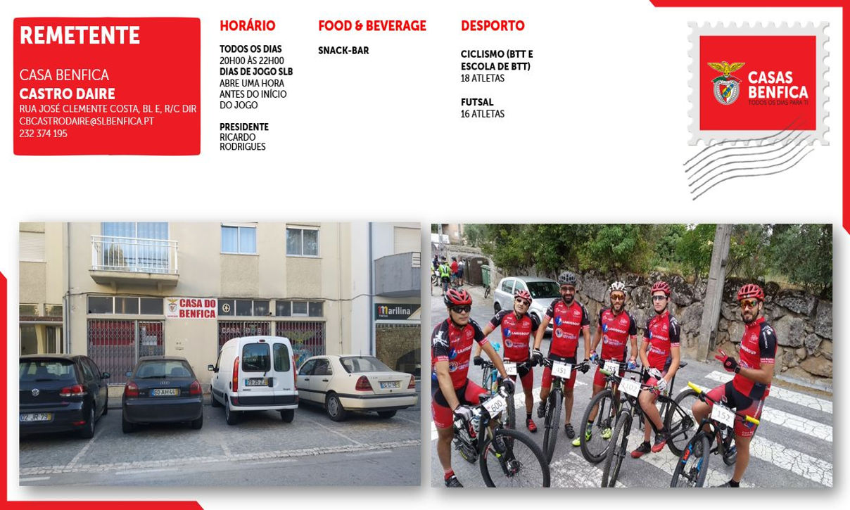 A Casa Benfica Castro Daire foi fundada a 4 de agosto de 2000 e, anos volvidos, inaugurada no dia 4 de novembro de 2004 pelo Presidente do Sport Lisboa e Benfica, Luís Filipe Vieira. Localizada na Beira Alta, distrito de Viseu, a vila respira Benfica e a percentagem de Sócios e adeptos do SL Benfica é muito elevada. Possui, por isso, inúmeros associados, que são o principal motor da Casa. As modalidades existentes são a face exterior visível da vida deste espaço. Mais de 30 atletas, repartidos pelo futsal e pelo ciclismo (BTT), levam o nome da Casa e do concelho a todas as partes do País, e não só, o que, para todos nós, é um motivo de grande orgulho.