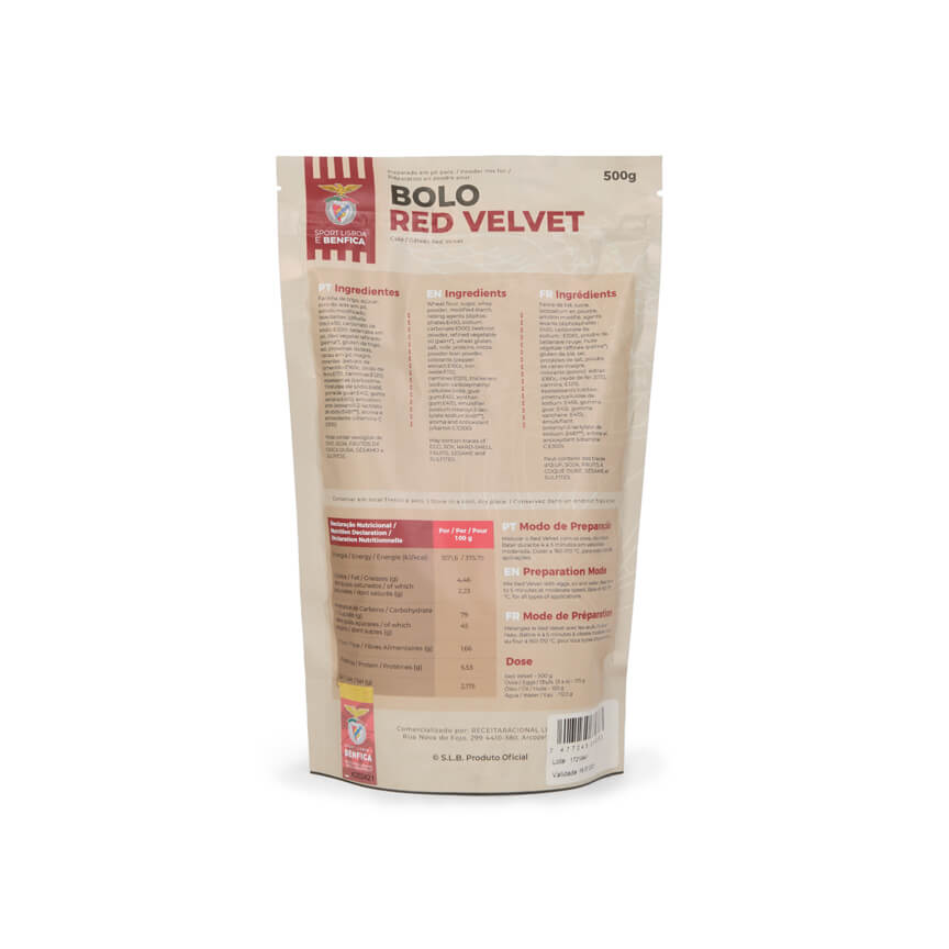 Preparado em pó para bolo Red Velvet do SL Benfica. Prepara o teu red velvet em 5 minutos e coloca no forno. Pode conter vestígios de: soja, ovo, frutos de casca rija, sésamo e sulfit...