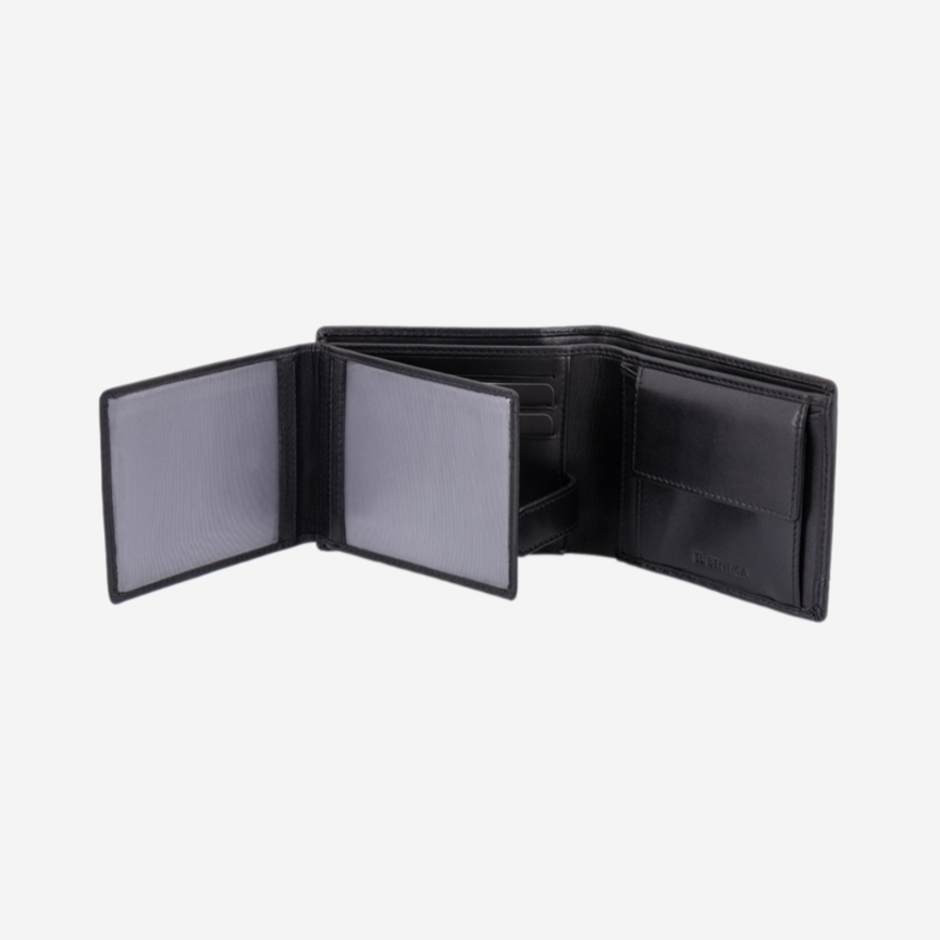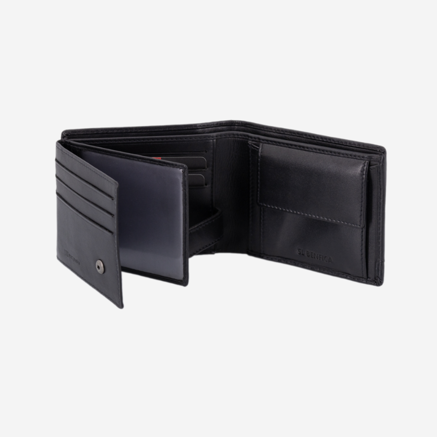 Carteira preta com presilha interior, em pele genuína, do Sport Lisboa e Benfica.