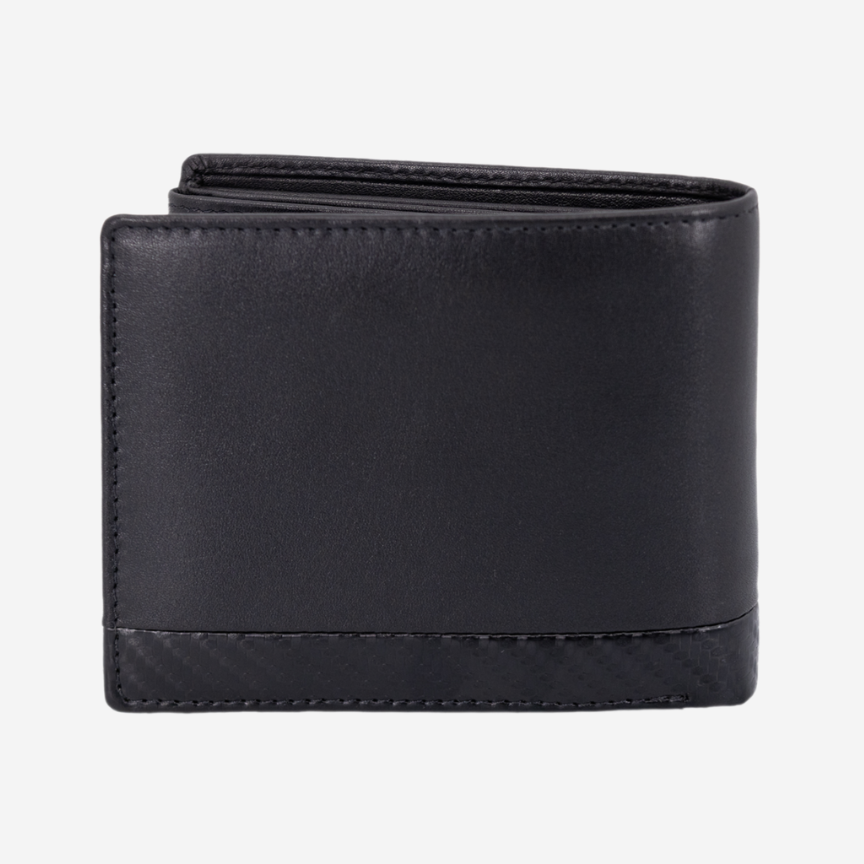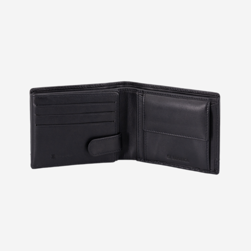 O interior da carteira é composto por compartimentos para cartões, notas ou pequenos documentos e um porta-moedas.