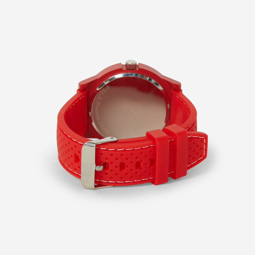 A bracelete, feita de silicone, e o mostrador são vermelhos e os números e ponteiros são brancos.