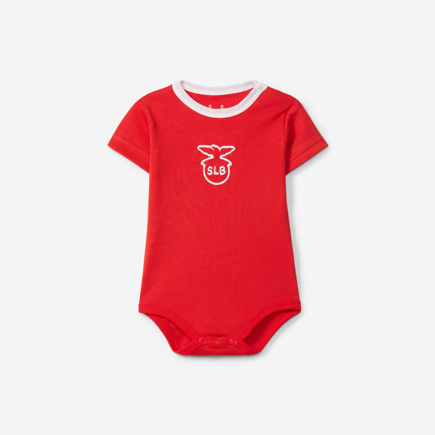 Body vermelho, de manga curta, com gola em rib branco e molas, no ombro e entre as pernas, para facilitar o vestir. Ao centro do peito, destaca-se o emblema do clube e a sigla “SLB”, em br...