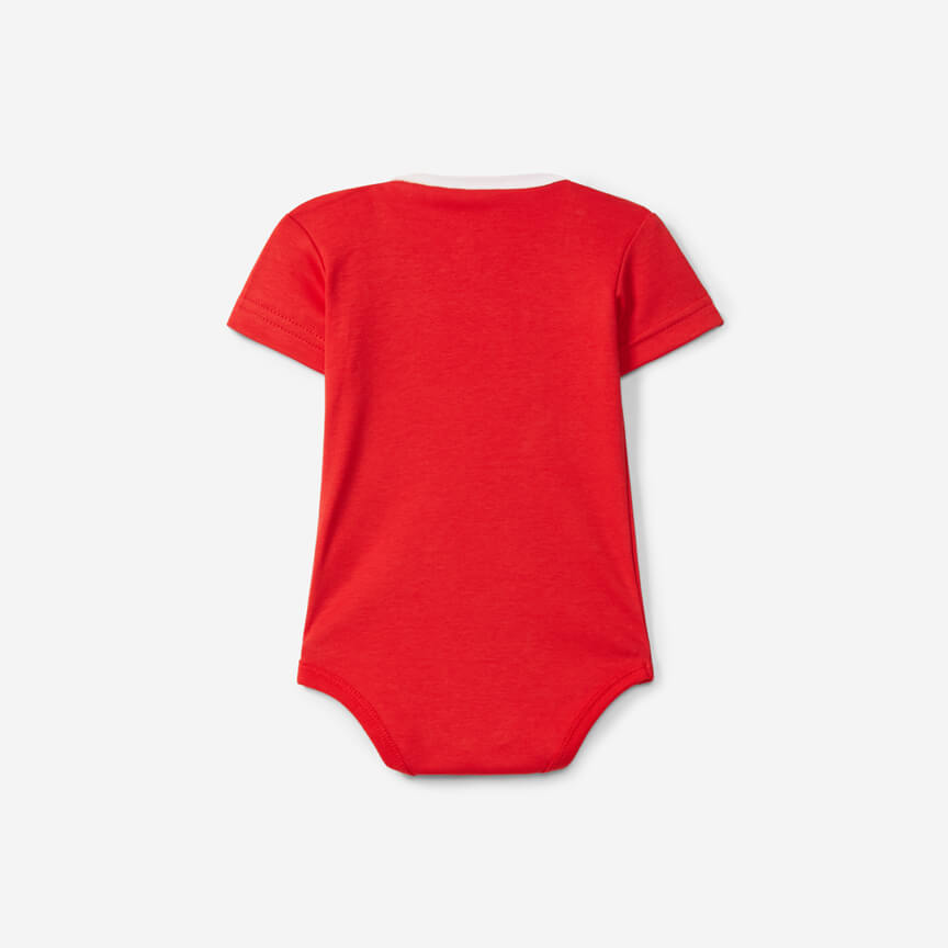 Body vermelho, de manga curta, com gola em rib branco e molas, no ombro e entre as pernas, para facilitar o vestir.