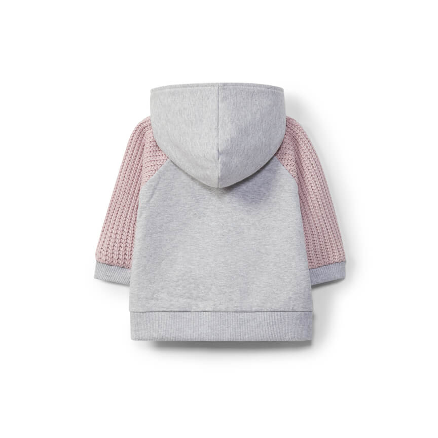 Casaco cinzento com capuz, mangas em malha cor-de-rosa e no lado esquerdo do peito, SLB bordado a cor-de-rosa sobre E Pluribus Unum bordado a cinzento escuro.