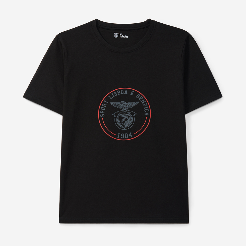 T-shirt preta, com aplicação do emblema do clube e das inscrições "Sport Lisboa e Benfica" e "1904", acompanhados de um outline vermelho.