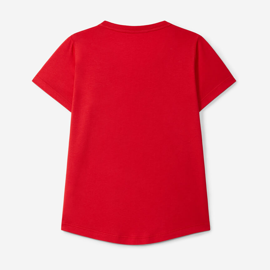 T-shirt vermelha do Sport Lisboa e Benfica para mulher, com a inscrição "SLB" em branco, destacada sobre um promenor branco e preto.